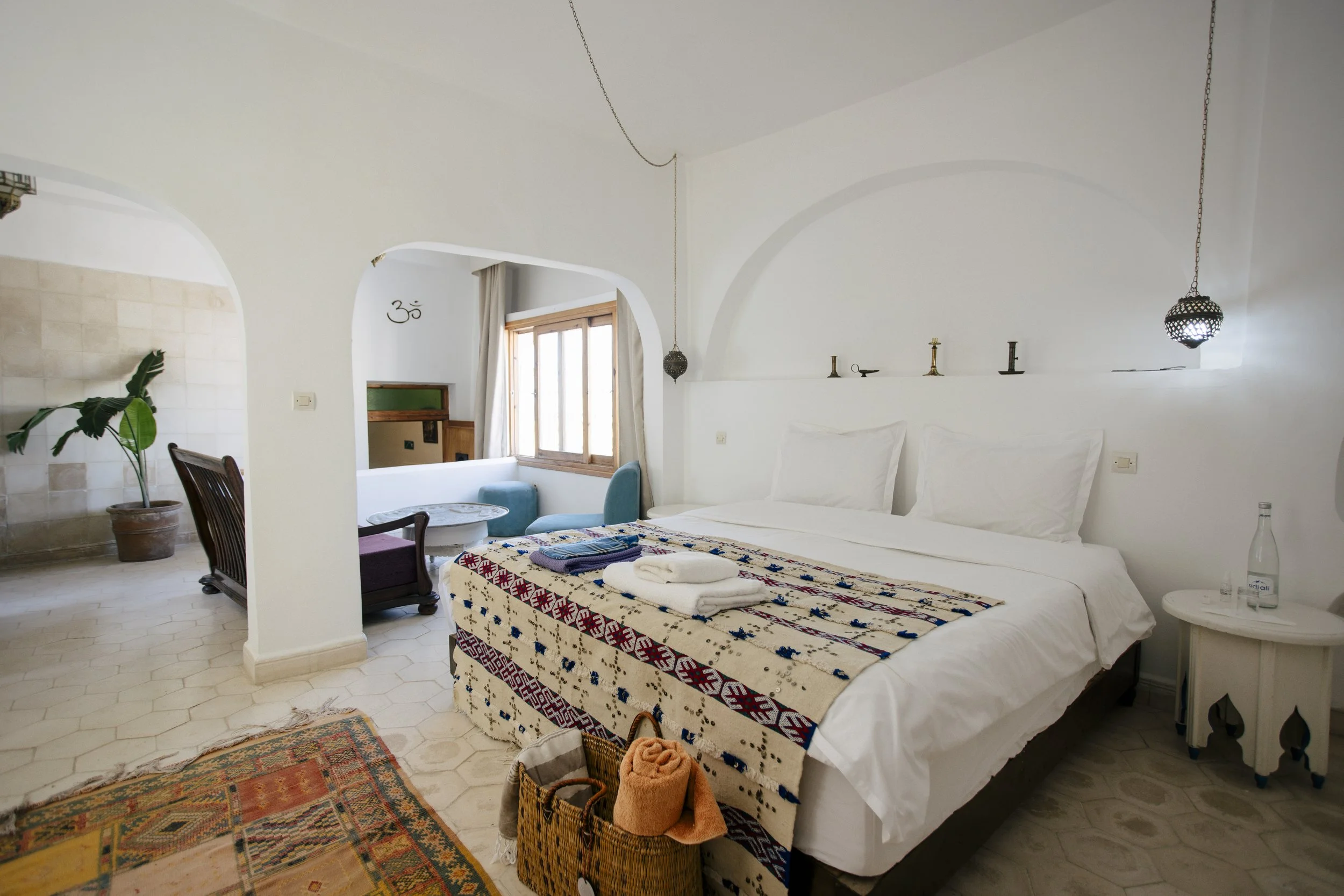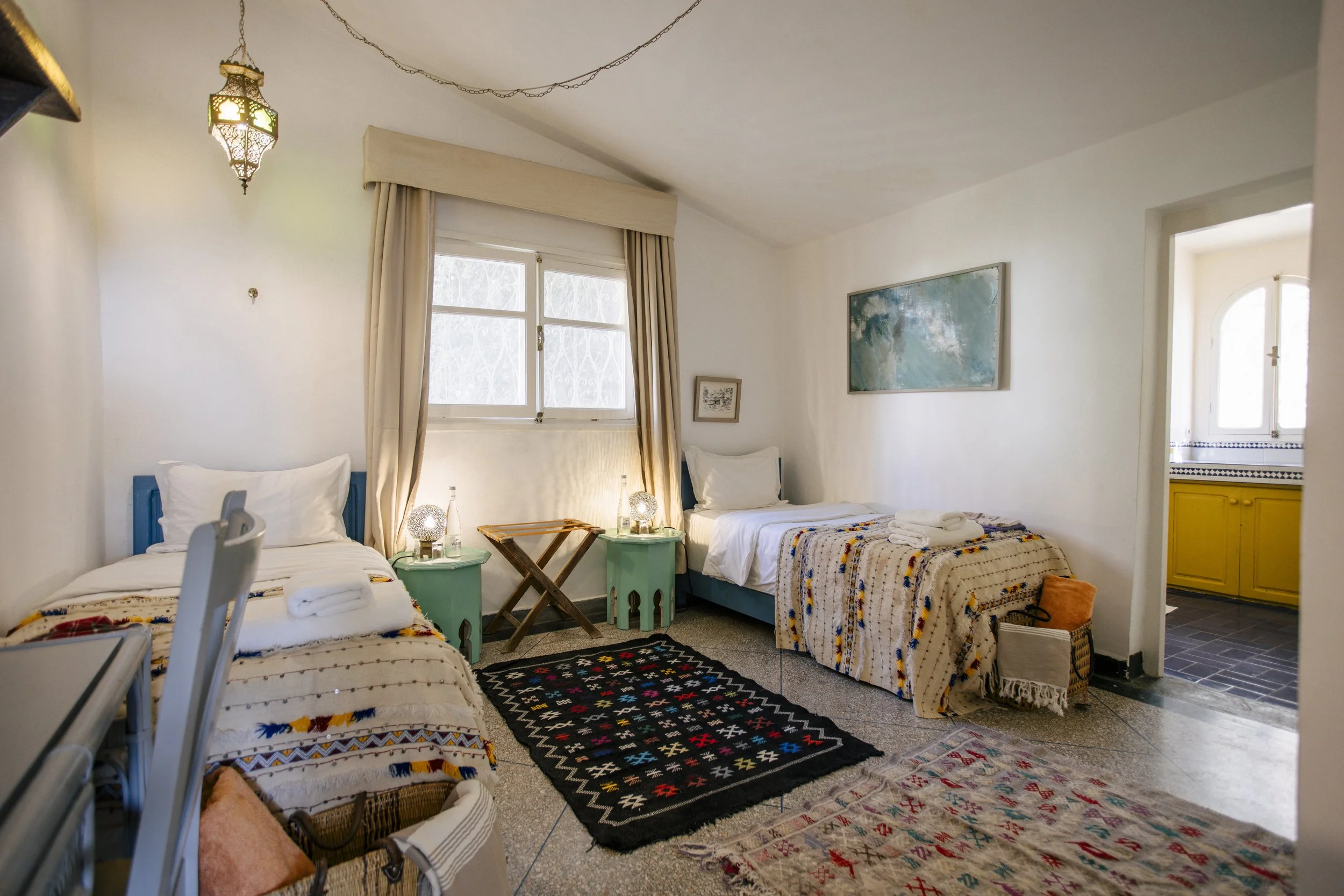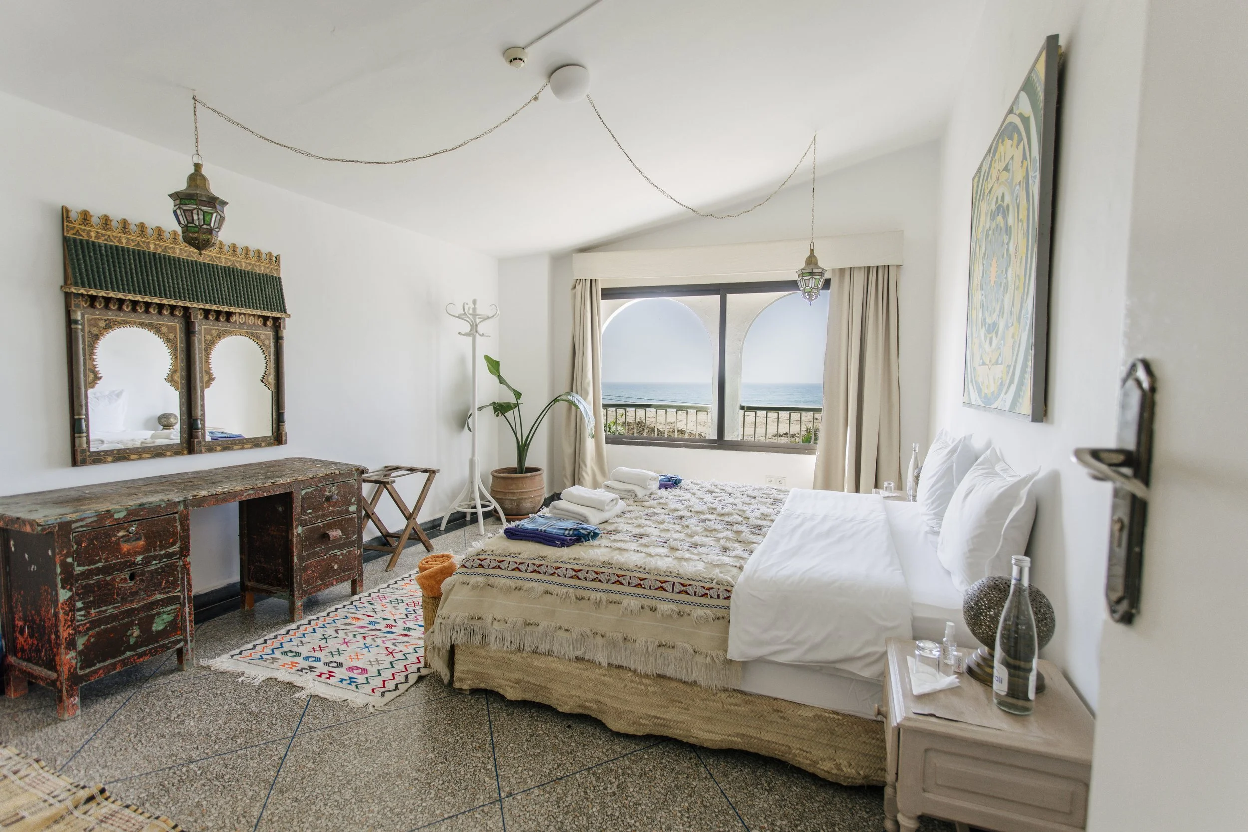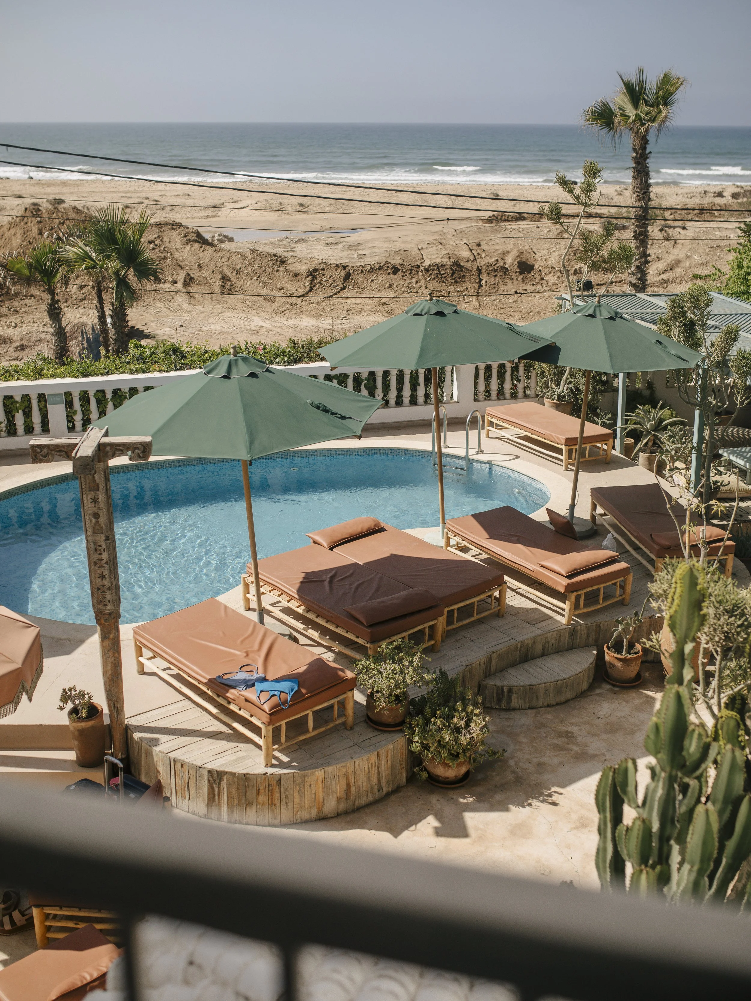 Our home for the week is the regions oldest surf house. A beautifully designed place that breathes Moroccan lifestyle, right on the beach! Elegant interiors, handwoven textiles, peaceful terraces with views stretching out to sea, and a pool with the sound of the Atlantic in the background. The rooms are simple and comfortable. The shared spaces are where the magic happens.